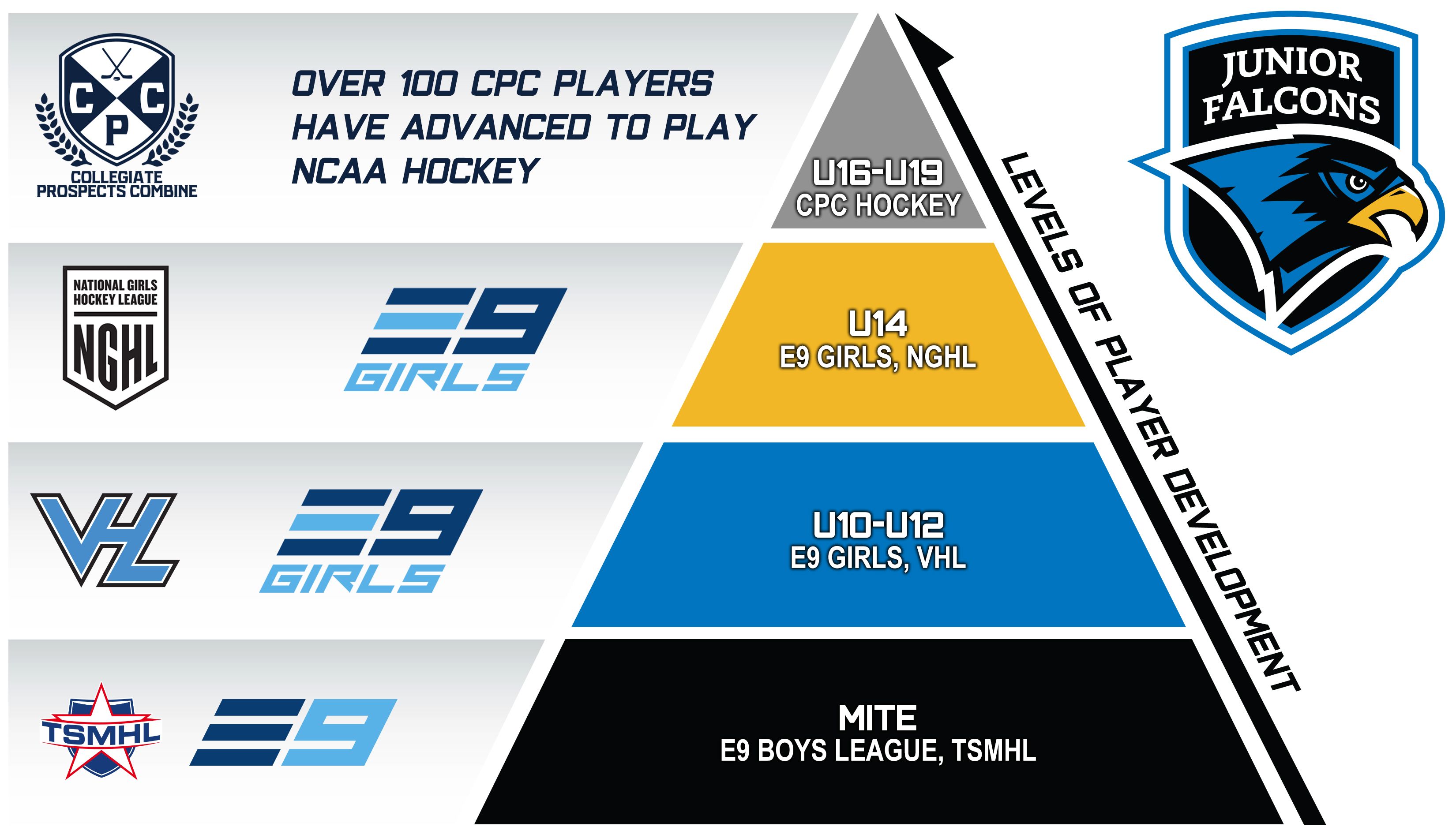The members the of E9 Girls League are the only girls teams afforded the unique opportunity to also play against co-ed teams in the Valley Hockey League. As a member of the E9 the Jr. Falcons girls program provides training and competition that no other girls program in New England offers, including the ability to compete in the VHL & E9 against boys teams from across Massachusetts.